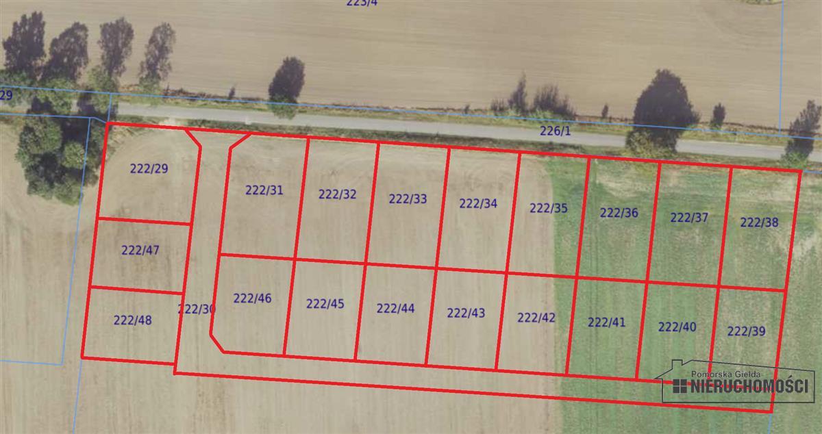 - działka nr 222/43, pow. 735 m2, grunty orne RIVa, ok. 23m x 32m, cena 80 900 zł - cena z rabatem 20% - 64 720 zł;