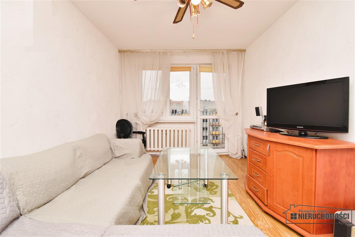 • pokój (ok. 15,00m2) – linoleum, tapety, meble, telewizor, okno pcv, okno balkonowe pcv, wyjście na loggię;