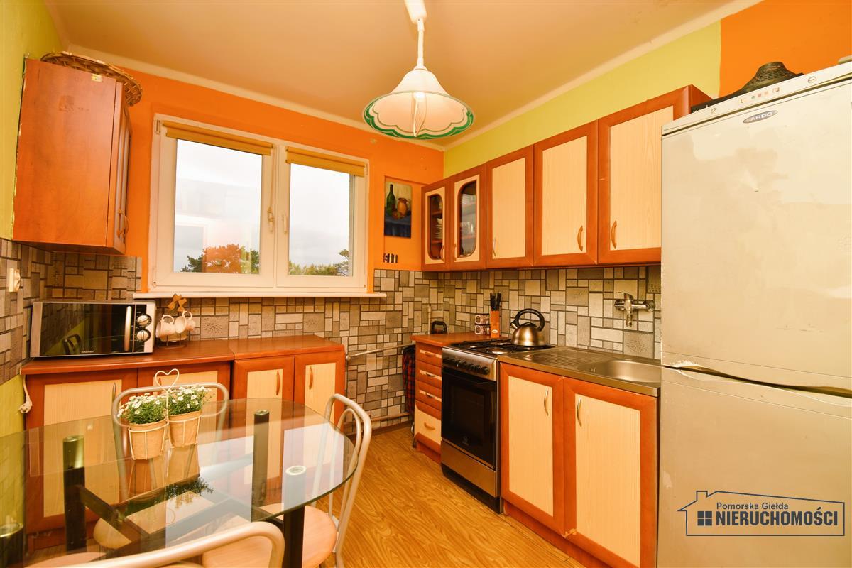 • kuchnia (ok. 7,70m2) – linoleum, ściany malowane, tapeta, meble kuchenne, kuchenka gazowo-elektryczna, zlew, lodówka, mikrofalówka, okno pcv;