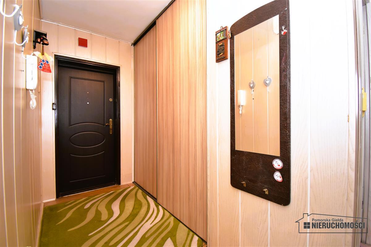 • przedpokój (ok. 6,10m2) – linoleum, panele ścienne, wnęka zabudowana szafą, domofon.
